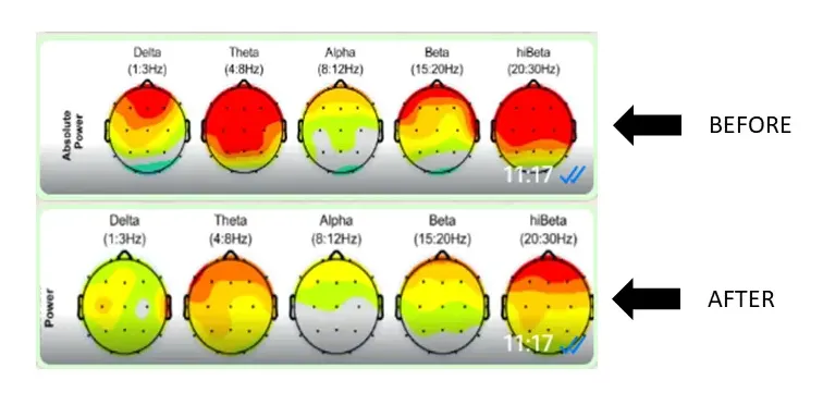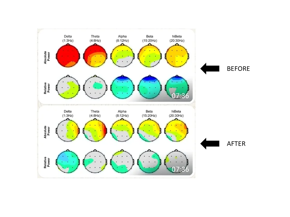 Small sensors are gently placed on your scalp. You relax while watching visuals or playing a game.Your brain activity is read in real time and fed back to you through the screen or sounds. Your brain “learns” to shift into healthier patterns — just like practicing a new skill.Many people begin to notice changes within a few weeks, and a full course of training builds lasting result.
