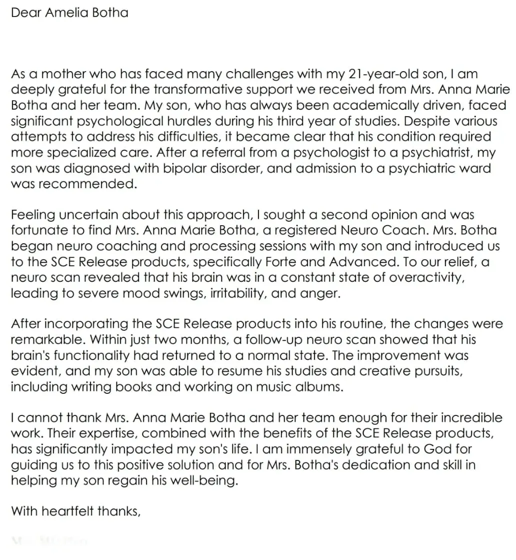 After beginning Neurofeedback Training and brain nutrition support, the difference has been incredible. He’s calmer, more patient, and far more organized with his work. I’ve noticed a real effort to finish what he starts — something that rarely happened before.